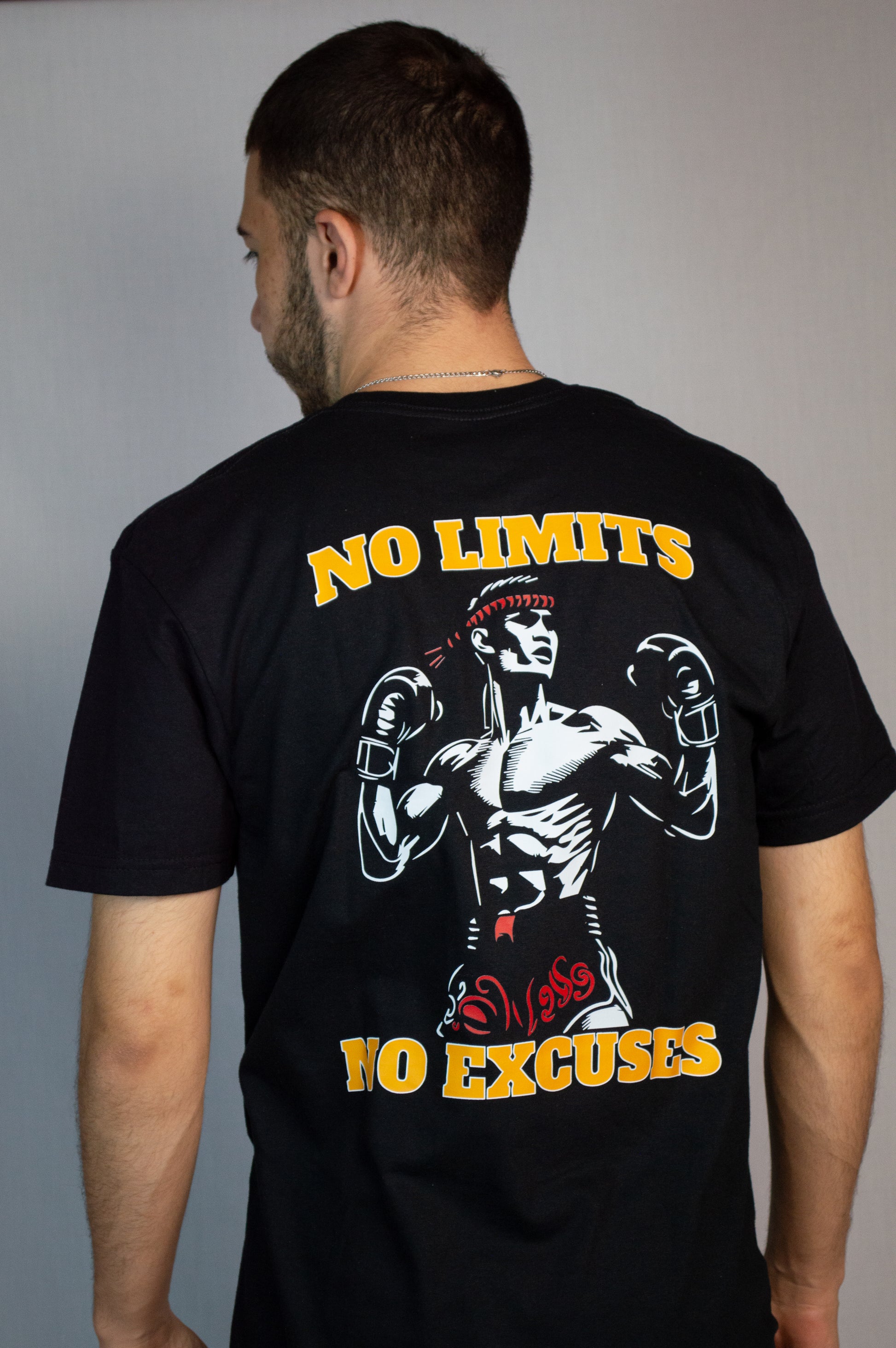Diseño que respira Muay Thai puro. Una declaración sin reservas: no hay excusas para detenerte, no hay límites que frenen a quien entrena con el corazón decidido.